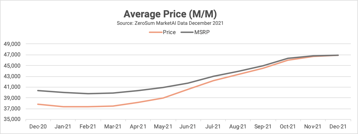 MarketAI also tracks turn rates of new inventory across the industry, representing how quickly new vehicles are being sold. The average turn rate of new inventory was 110% in December, representing an annual high. These record high turn rates mean dealers are now selling more vehicles in a month than they have on their lot on any given day, representing a new reality that is likely to continue into 2022, and emphasizing the importance of dealers continuing to sell faster than their competitors.